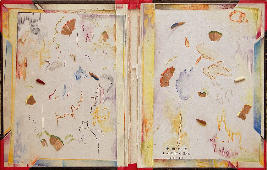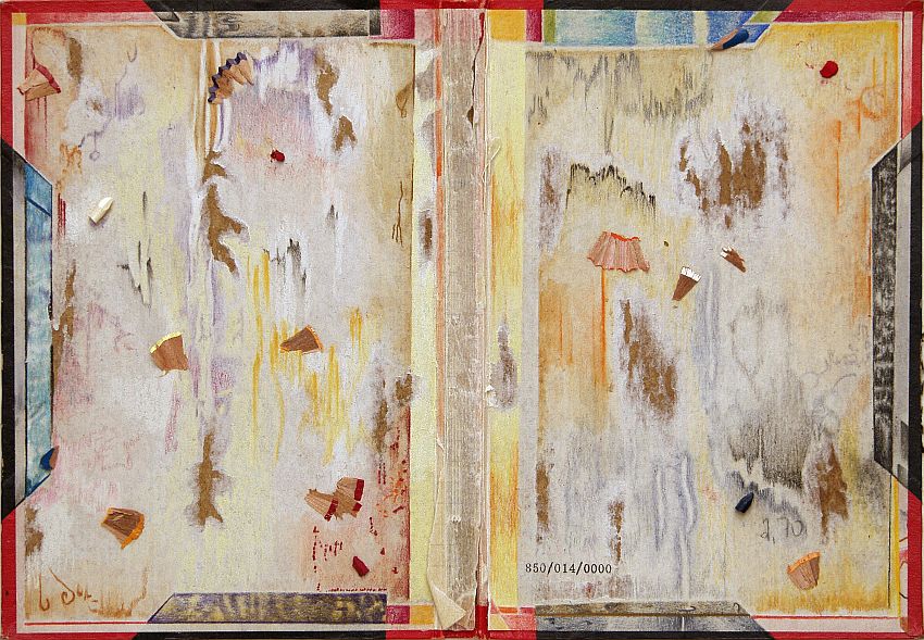 Destroyed Diary II, 2007 Farbstift, Aquarell, Collage auf Tagebuchdeckel 21,4cm x 30,7cm