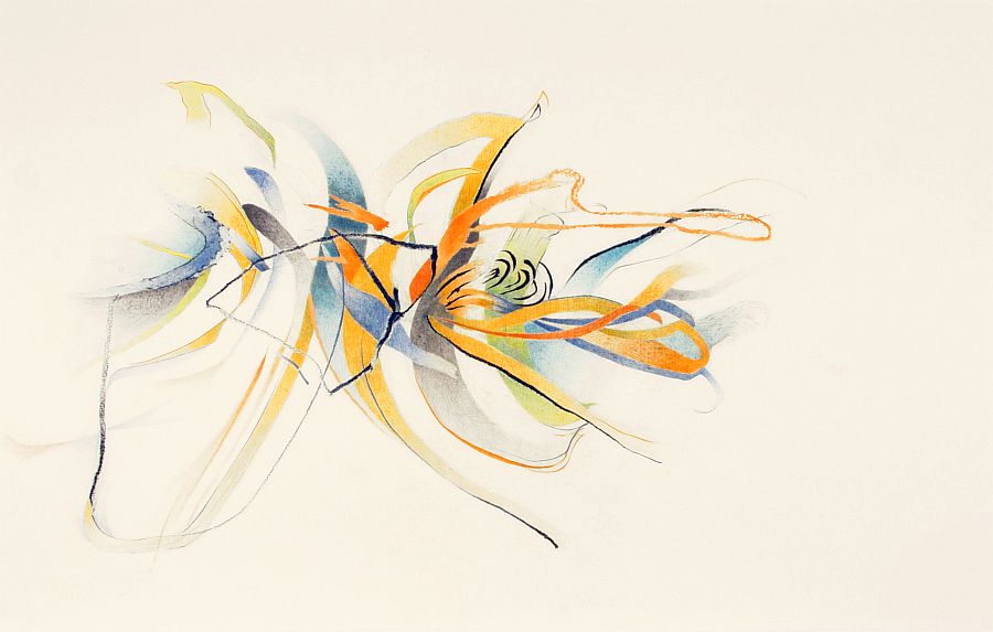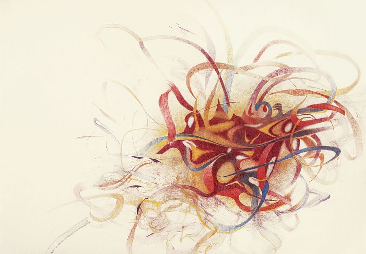Bewegung und Zufall spielen eine entscheidende Rolle in meinen Arbeiten. Es entstehen zunächst gestische Bewegungsspuren durch ein blindes, zwei-händiges haptisches Ertasten des Blattes mit Pastellkreide. Blind deshalb, damit keine kognitive Kontrolle über die bildnerische Aktion stattfindet. Diese Arbeitsweise erlaubt z.B. impulsive, spontane Entladungen, ohne dass diese bewußt gesteuert werden. Nach dem Erstellen mehrerer solcher "Aktionsblätter" werden diese auf ihr bildnerisches Potential hin gesichtet, eine Auswahl getroffen und dann erfolgt die Weitergestaltung. Das Rohmaterial der Aktionsblätter bildet dabei den "optischen Provokateur" (Max Ernst), der den Bildanlass gibt. Durch das Aufgreifen und Weitergestalten der von der Aktion hinterlassenen Spuren erhalten diese einen völlig neuen Charakter: Leichte, z.T. kaum sichtbare Ausdrucksspuren werden mittels Farbstift wieder ans Licht geholt und hervorgehoben, andere zurückgedrängt oder ausradiert; Farben werden intensiviert und differenziert, Formen und Linien kristallisieren sich heraus, dennoch bleibt, bei aller Verwandlung der Form- und Farbgebung, letztendlich die Dynamik der ursprünglichen Aktion erhalten.
