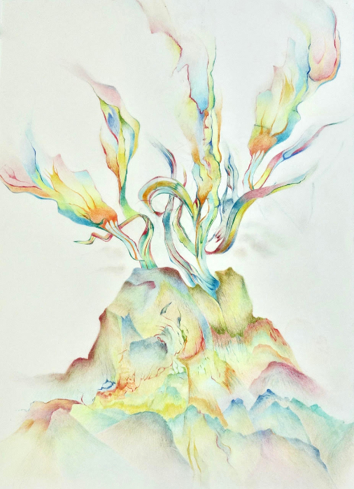 Eruption, 2023 aquarell, Farbstift auf Papier 70 x 50 cm
