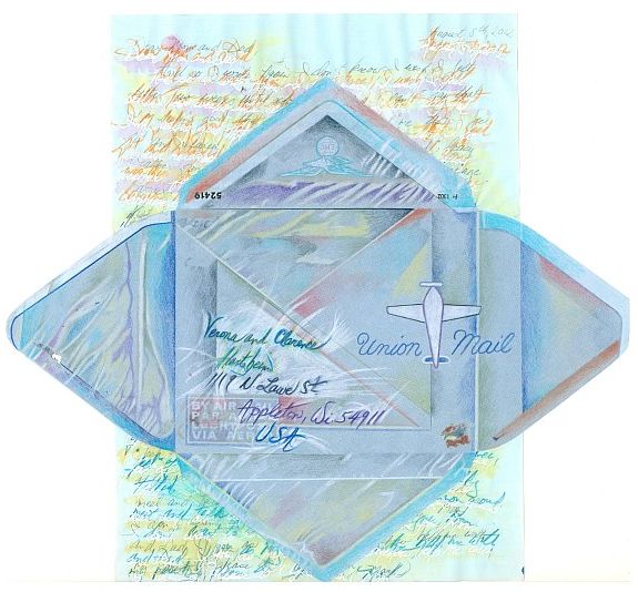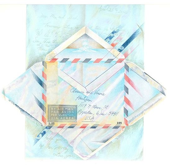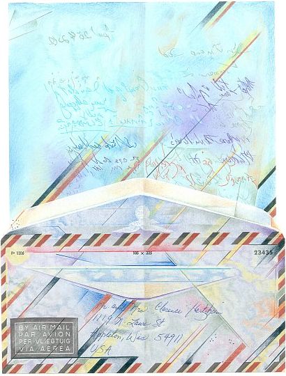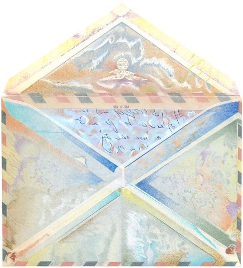 Unverhofftes Glück, 2012 Farbstift a. Luftpostpapier u. -umschlag 29,3 x 29,4 cm