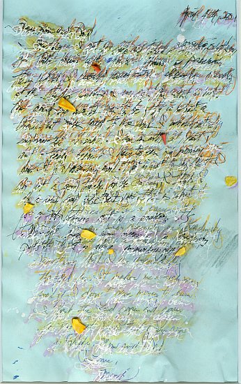 Ich begann meinen Eltern wieder zu schreiben. Obwohl sie vor vielen Jahren verstorben waren, war ich überzeugt, dass ich sie auf diese Weise dennoch erreichen würde. Ich schrieb auf Luftpostpapier und erstellte mittels Kohlepapier eine Kopie von jedem Brief. Die Originale behielt ich, die Kopien wurden gestalterisch verfremdet. Aufgrund des sehr persönlichen Charakters der Briefe habe ich die Schrift in unterschiedlichem Maße unleserlich gemacht oder mithilfe des Briefumschlags verdeckt. Textfragmente