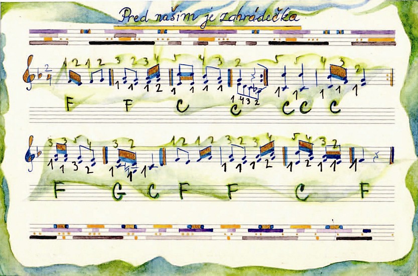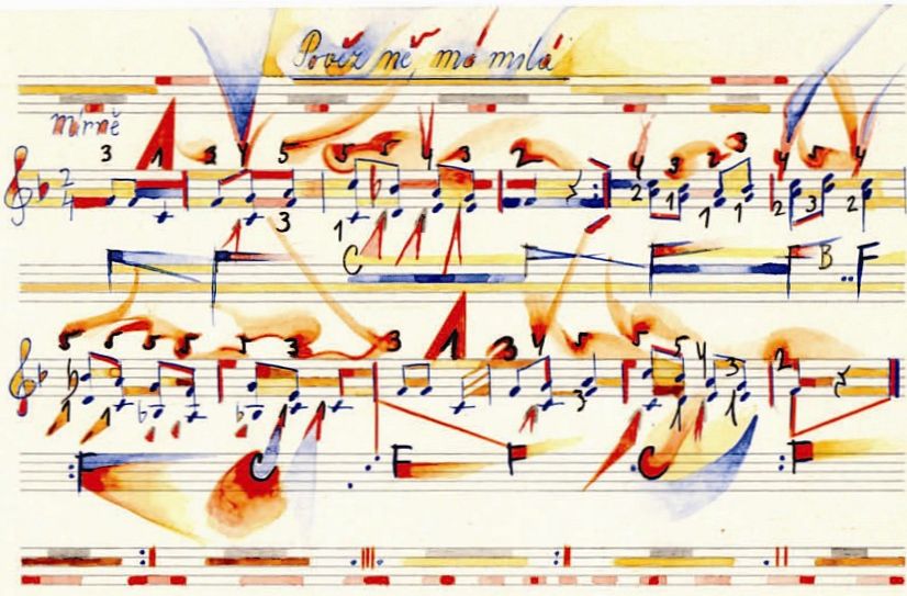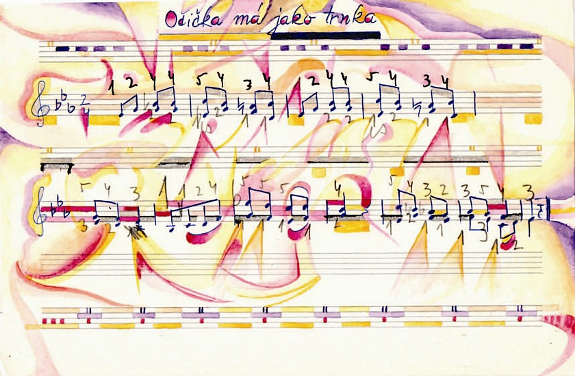 Angeregt durch ein altes Notenheft meiner Frau, die als Jugendliche Akkordionspielen gelernt hat, begann ich die vier handschriftlich notierten Lieder am Anfang des Heftes gestalterisch aufzuwerten. In den alten tschechischen Titeln dieser traditionellen folkloristischen Lieder spiegeln sich die Themen Liebe und Sehnsucht wieder.