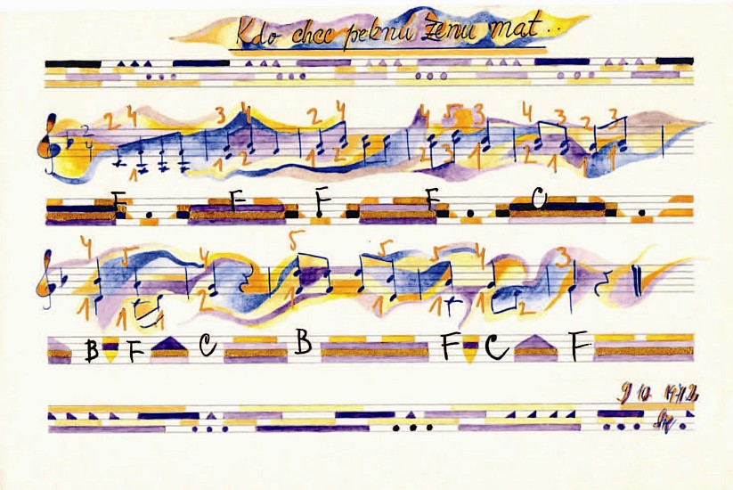 Pověz mě, má milá (Sag es mir, meine Liebste), 2014 Aquarell, Farbstift, Graphit auf Notenpapier 16,5 x 25,3 cm