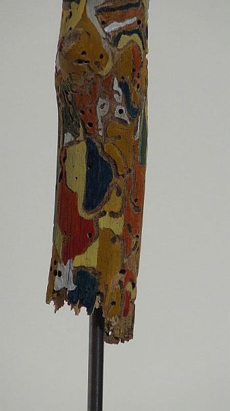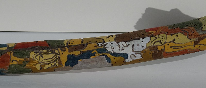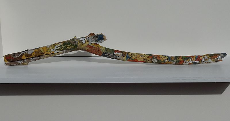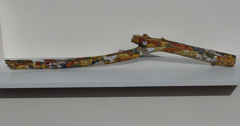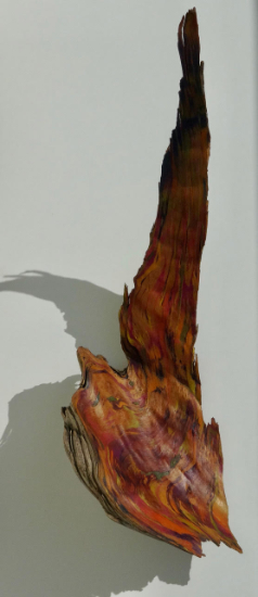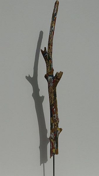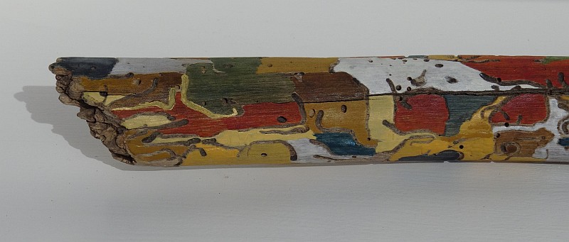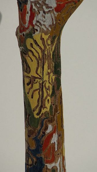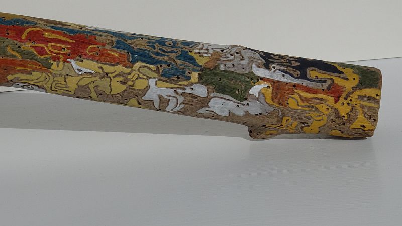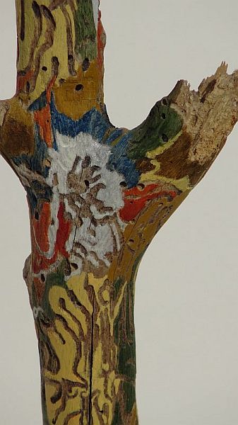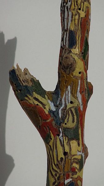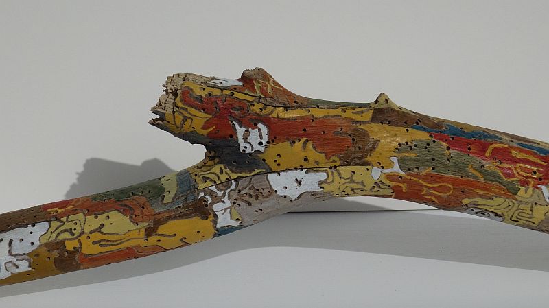 Totem I und II: Ausgangspunkt dieser beiden Objekte war ein Ast aus Treibholz, welcher von Würmern angefressen worden war. Dabei sind faszinierende Spuren entstanden welche farblich hervorgehoben wurden. Deckend zu malen auf einer konvexen Oberfläche erinnerte mich an Totempfähle, von daher der Titel.