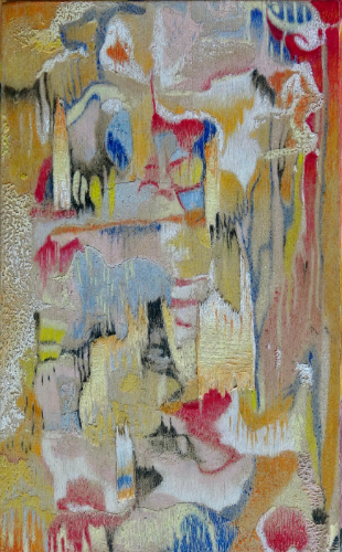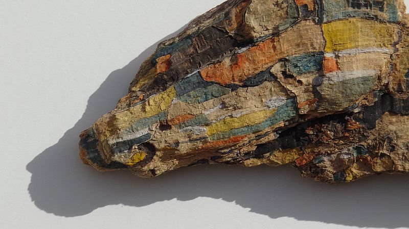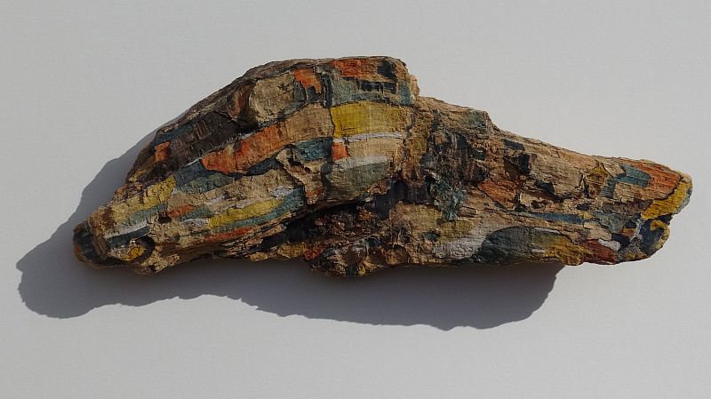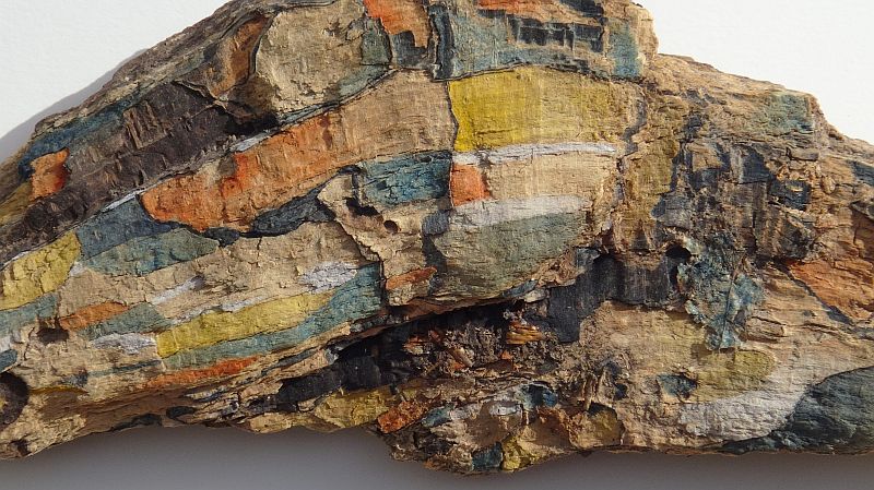 Objet trouvé: Ausgelöst wurde diese Werkreihe durch ein Fundstück: Ein unregelmäßiges Stück Holz vom Boden des Waldes. Dessen ziselierte, unebene Oberfläche schien förmlich nach Farbe zu verlangen. Aquarellfarbe als Medium tönt das Holz, lässt aber durch ihre Transparenz dessen Charakter noch gut zur Geltung kommen.