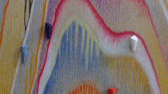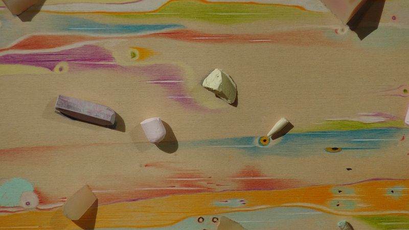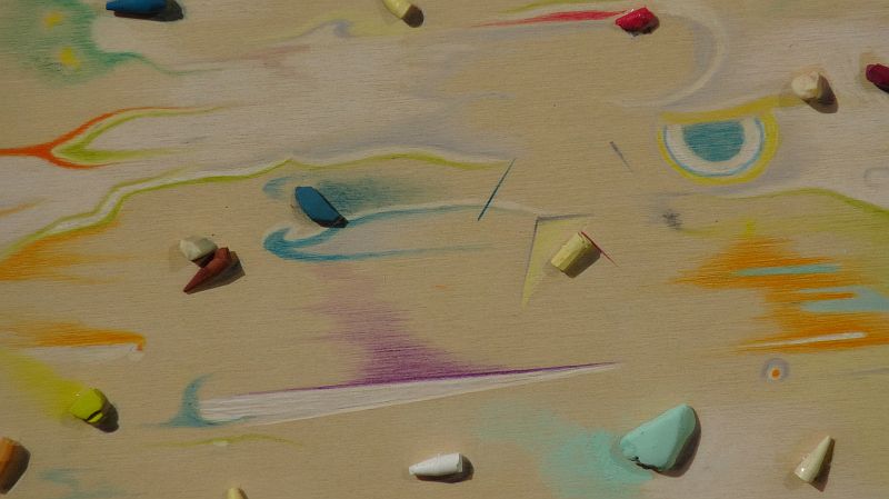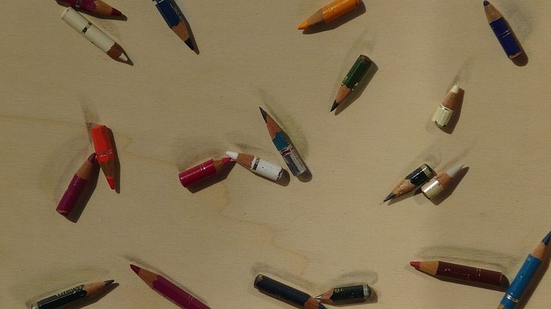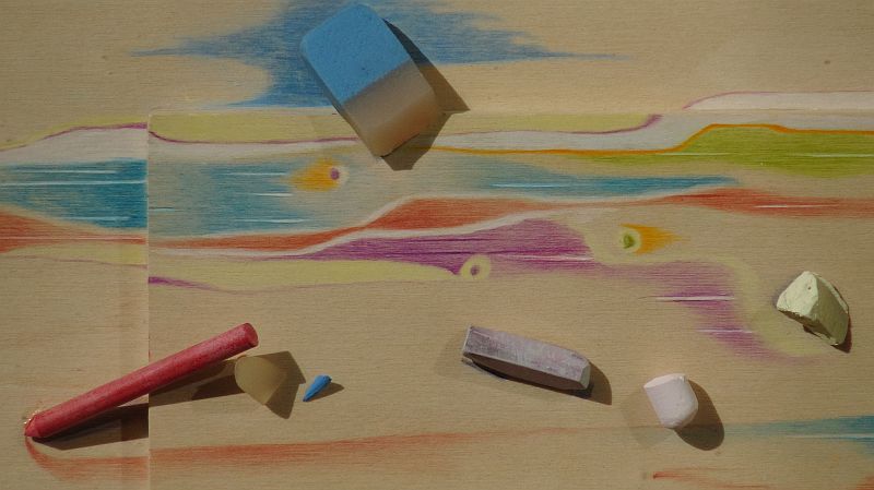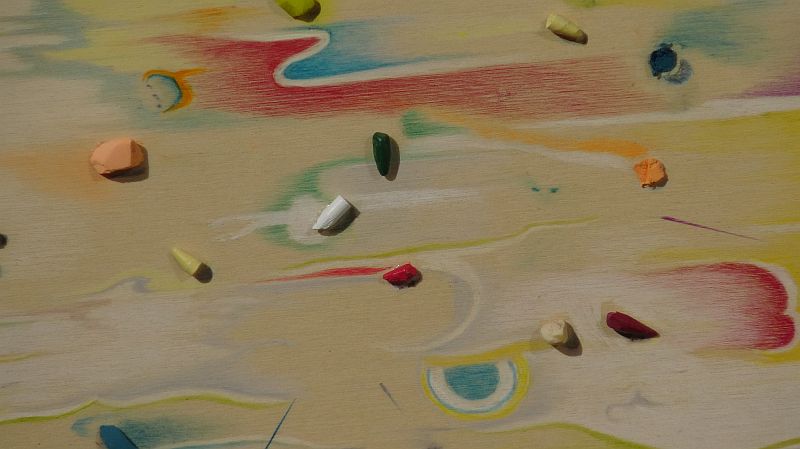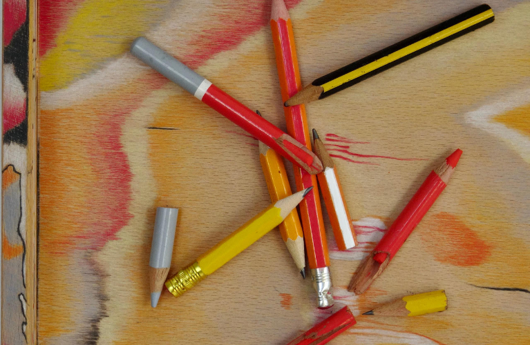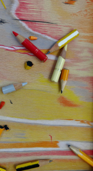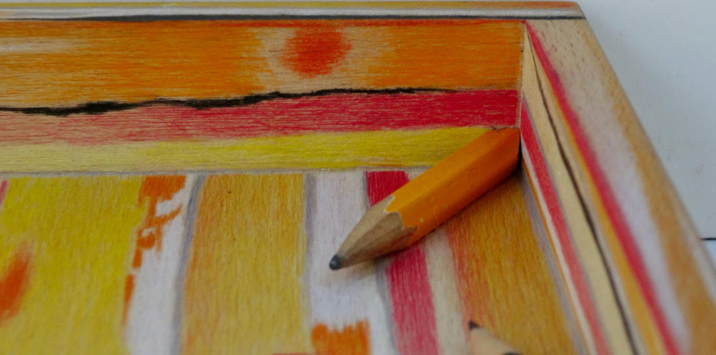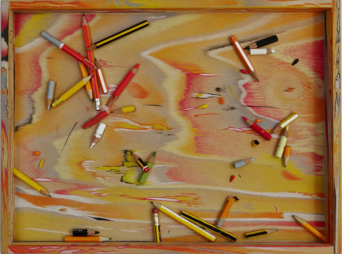 Pencil Picture: Diese Arbeit stellt den Versuch dar, aus Buntstiftstummeln eine ansprechende Komposition zu gestalten. Es entsteht ein Licht-Schatten-Spiel durch die tatsächlich vorhandenen Lichtverhältnisse und die gezeichneten Schlagschatten, welche die Stifte optisch an den Grund binden.