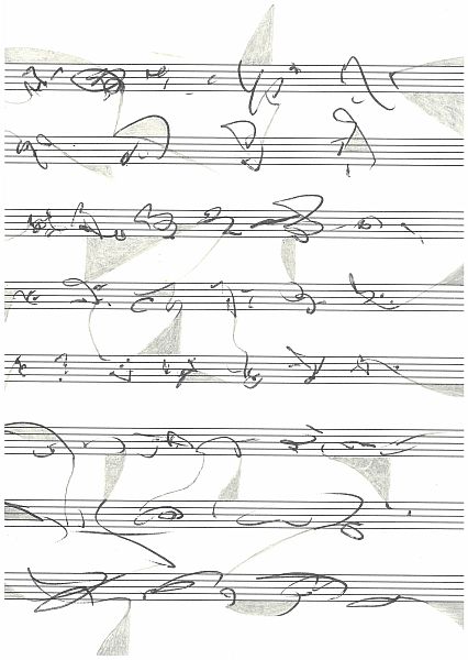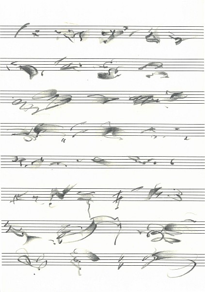 Da ich anfänglich auf vielen Seiten des Heftes schnell gezeichnet habe, bevor ich nachträglich die Linien mit Farbe oder Grautönen verändert habe, hinterließen die Grafitspuren einen Abklatsch auf den gegenüberliegenden Seiten. Rorschach Rhythmen, die einzige doppelseitige Arbeit, macht Gebrauch von diesem Effekt.