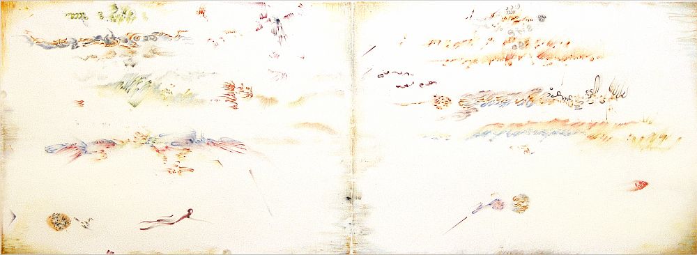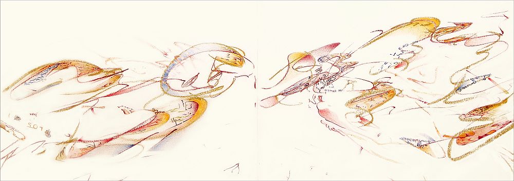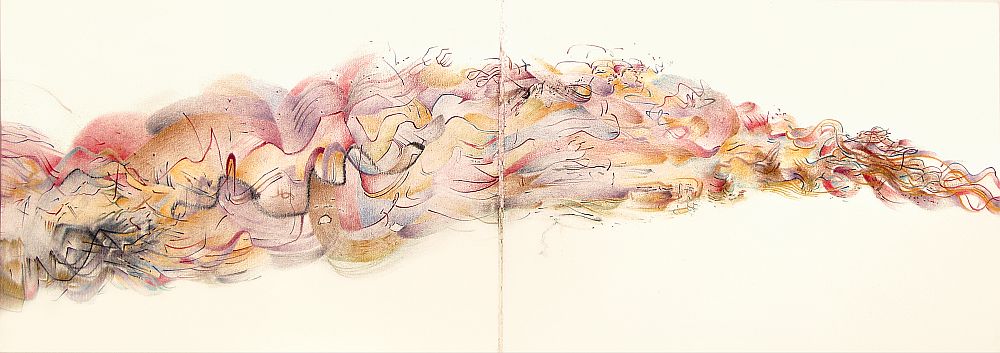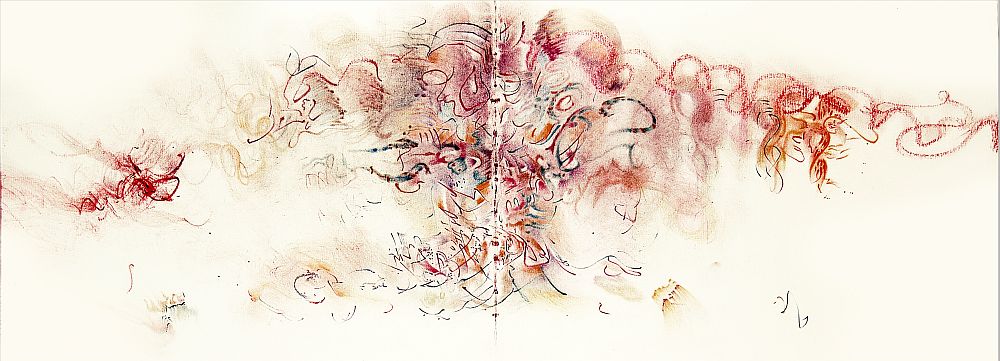 Die fünf schmalen, querformatigen Zeichnungen entstammen einer Werkreihe mit dem Namen The Imaginary Sketchbook. Die Blätter sind alle, direkt oder indirekt, aus dem Arbeiten im Skizzenbuch hervorgegangen. Die ersten beiden Zeichnungen (terra incognita, Spurenelemente), die wie aufgeschlagene Seiten eines Buches wirken, gehen zwar auf Bilder zurück die tatsächlich im Skizzenbuch entstanden sind, sind aber weit über diese hinausgewachsen. Die ursprünglichen Bilder waren gestische oder skripturale Pastell-zeichnungen die jeweils eine Doppelseite des Skizzenbuchs ausmachten. Nach ihrer Fertigstellung wurden sie aus dem Skizzenbuch herausgelöst und hinterließen dabei - zunächst als Zufallsprodukt - Spuren von Pastellkreide die später den Bildanlaß für die jetzigen Zeichnungen lieferten. Leichte, z.T. kaum sichtbare Bewegungsspuren oder Schriftzüge, die mittels Farbstift und Papierwischer wieder ans Licht geführt wurden und dabei einen völlig neuen Charakter als ihren Ursprünglichen gewannen: verspielte, vielfarbige, organische sowie geometrische Formen. Die letzten drei Bilder (Los, Microcosm, Tail of the Comet) sind direkt im Skizzenbuch entstanden und vertiefen das Aufgreifen und die Weitergestaltung von Spuren jeglicher Art, seien sie gestischer oder zufälliger Natur.